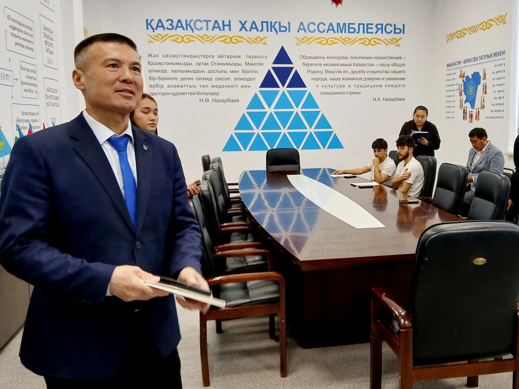 Проректор университета Есенова Аскар Абиулы СЕЙДАЛИЕВ показал нам весь центральный головной корпус, расположенный в большом студенческом городке, который привел нас в восторг. Сверху открывается вид на весь город, можно даже разглядеть морское побережье от морпорта до поселка Акшукур.